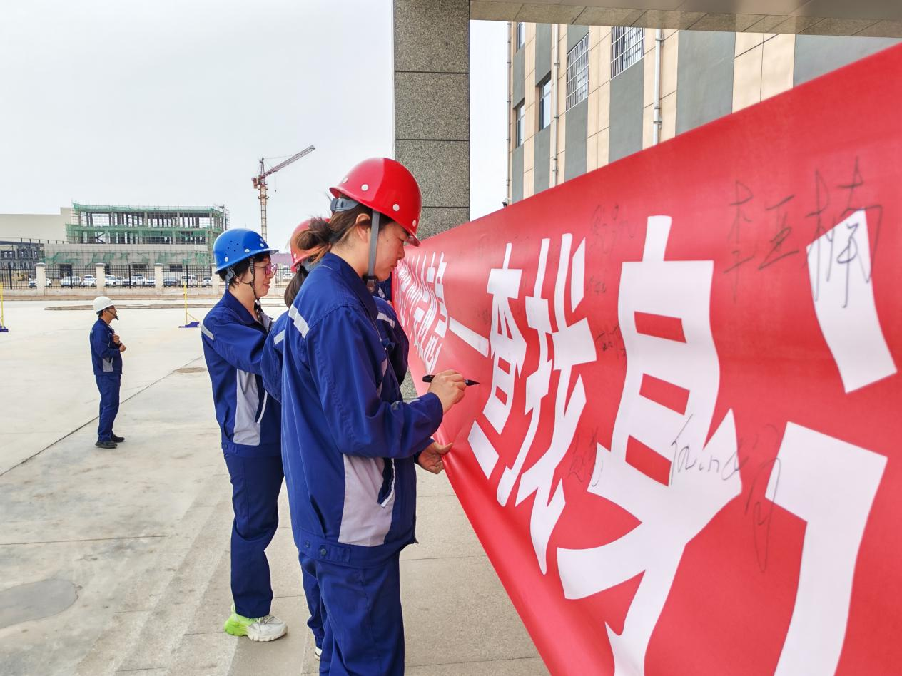 总经理带领全体员工在“人人讲安全,个个会应急-查找身边安全隐患”安全生产月主题条幅上承诺签字。