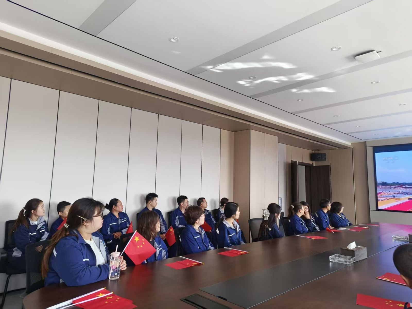 直播开始前,公司提前布置观看场地,调试影音设备以保障画面清晰、声音流畅,同时为在场人员准备了手持小旗帜,让庄重有序的观看氛围提前弥漫开来。