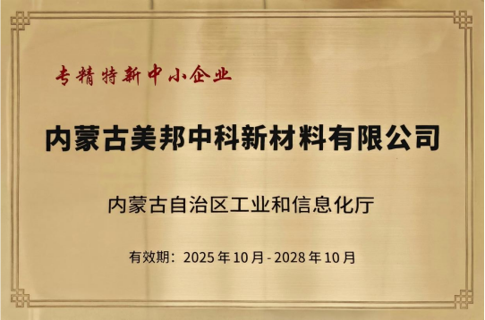 荣誉加冕,砥砺前行。未来,内蒙古美邦中科新材料有限公司将以此为新起点,珍惜“专精特新”中小企业荣誉称号,持续深化技术创新,聚焦主业、精耕细作,进一步提升专业化水平与核心竞争力,充分发挥“专精特新”企业的示范引领作用,在新材料领域不断突破,为推动区域经济高质量发展、构建现代化产业体系注入更强动力!