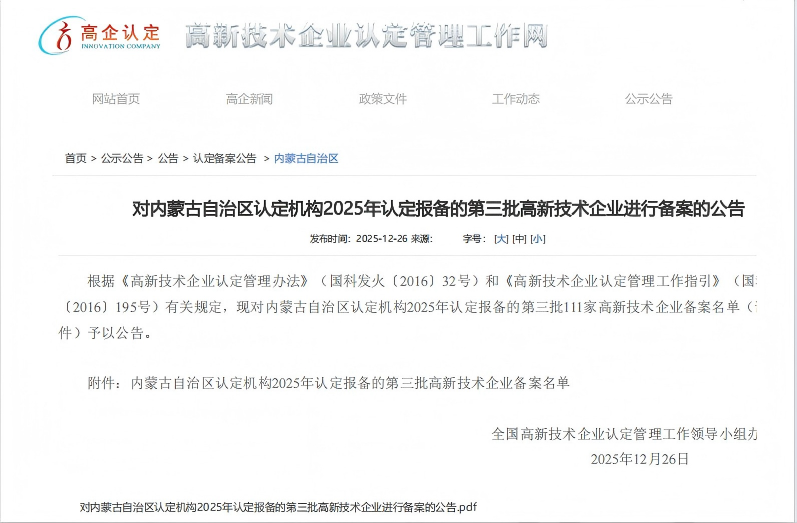 热烈祝贺我单位成功通过内蒙古自治区2025年高新技术企业认定