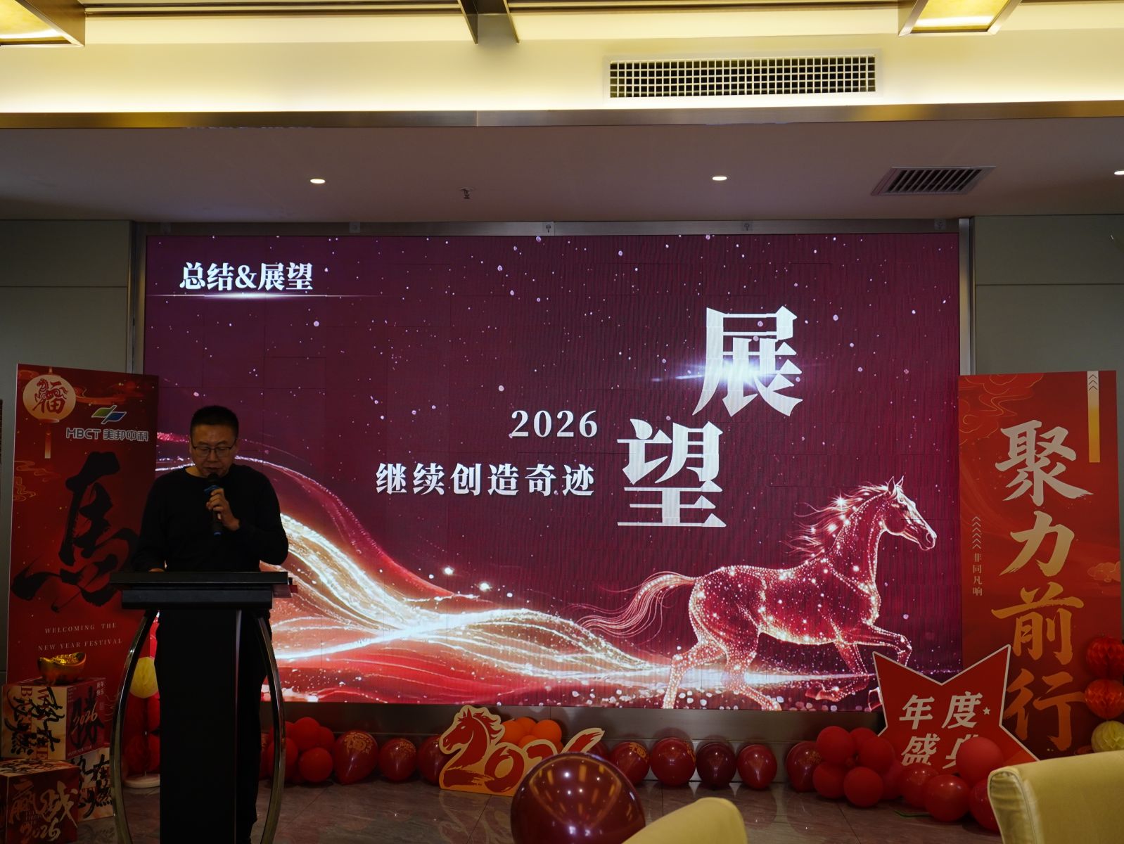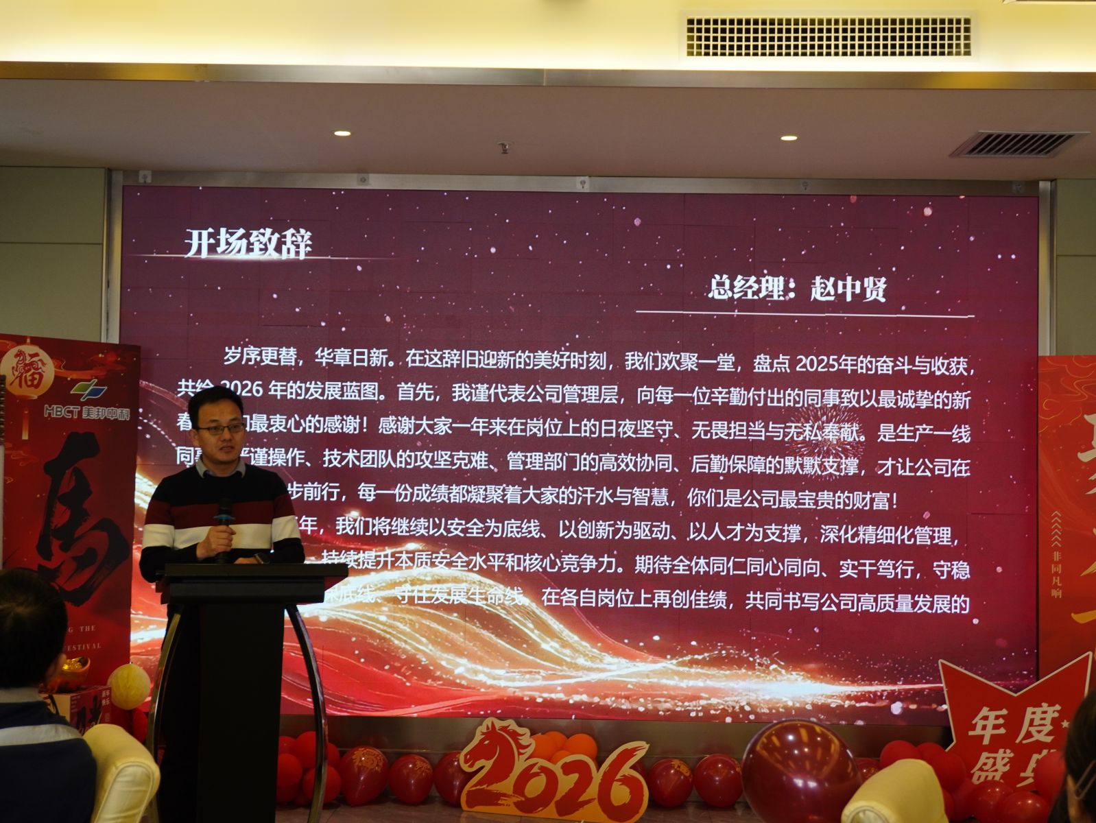 年会在主持人热情昂扬的开场中正式拉开帷幕。总经理赵中贤开场致辞,高度肯定全体员工2025年凝心聚力、勇毅笃行取得的亮眼成效,同时立足2026马年新形势,明确公司发展方向、注入奋进动力,凝聚起共赴新程的共识。