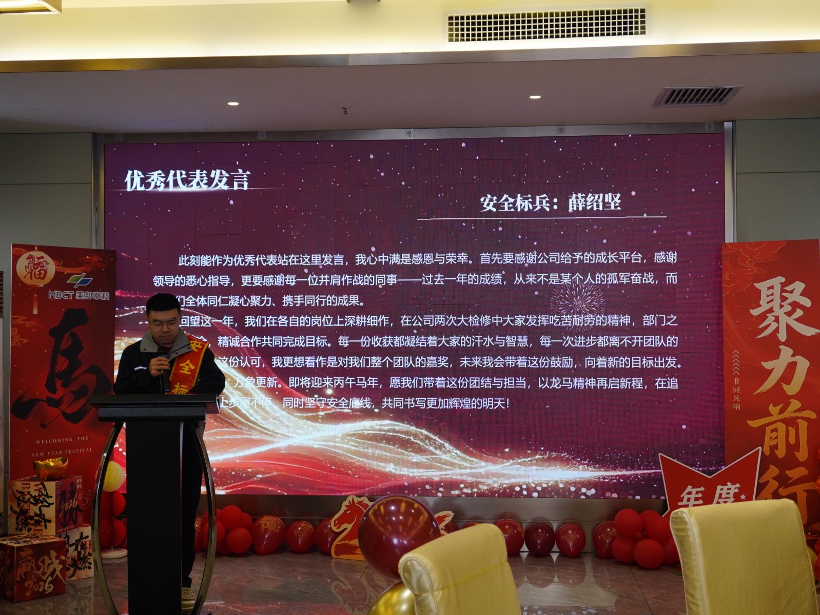表彰环节圆满落幕,优秀代表薛绍坚登台分享履职心得与成长感悟,朴实真挚的话语,生动诠释了坚守与奋斗的力量。执行董事张卫国随后作总结讲话,在回望过往、总结经验的同时,对2026年发展目标作出全面展望,为全体同仁指明前进方向。