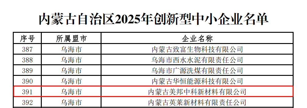 近日,内蒙古美邦中科新材料有限公司凭借在技术研发、成果转化及创新管理等方面的优异表现,成功获评“创新型中小企业”。此次评选由内蒙古自治区工业和信息化厅组织,旨在遴选在行业内具有突出创新能力、对产业升级起到推动作用的企业。