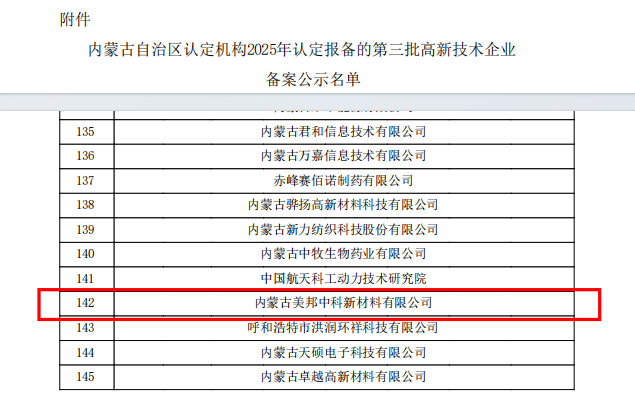 近日,全国高新技术企业认定管理工作领导小组办公室正式公告,内蒙古美邦中科新材料有限公司凭借卓越的科技创新实力与成果转化能力,顺利通过2025 年度高新技术企业认定。